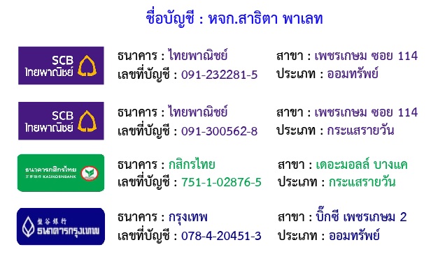 ลูกค้าทุกท่านสามารถชำระเงินค่าสินค้าและบริการ ผ่านบัญชีธนาคารดังต่อไปนี้